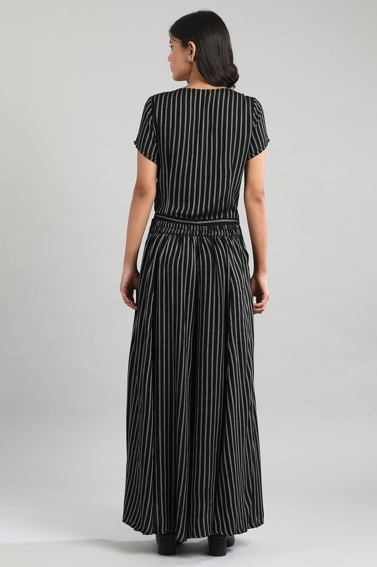 Black printed kurta in round neck and three-quarter sleeves. Paired with matching mid-rise palazzo.