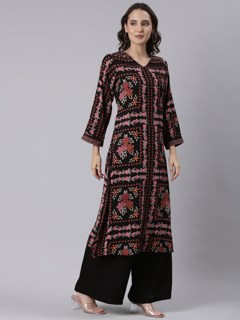 Get Ready To Shine In An Evening Event With This Pretty All Black Attire. The kurta Has V-Neckline And Patch Placement Print. It Is Paired With Pleated Parallel Pants.