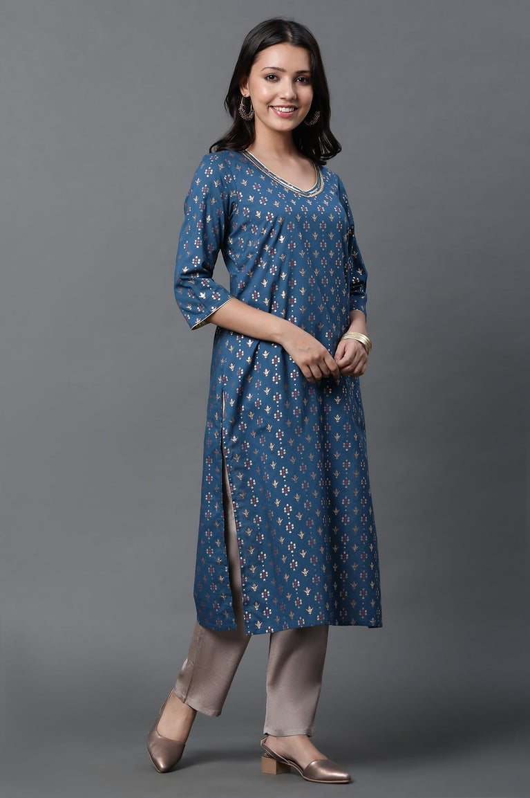 A vibrant expression of festive grace, this stunning kurta for women is a masterpiece of traditional design and modern comfort. Crafted in a breathtaking Azure Sky hue, it’s a piece designed to make you shine at any celebration. It's the kind of apparel you'll feel instantly radiant in. The silhouette is a timeless straight cut that flows effortlessly, offering both elegance and ease of movement right down to its classic straight hemline. This ethnic tunic features a flattering V-neckline, which is highlighted with delicate, shimmering ornamentation that serves as the yoke's focal point, beautifully framing the décolletage. Adding to its charm are the three-quarter sleeves, which provide graceful coverage and end in finely detailed cuffs that echo the intricate design at the neck. Subtle tape detailing runs vertically along the seams, a thoughtful touch that adds a structured yet decorative element to this beautiful garment. The all-over traditional print is inspired by classic motifs, rendered in a crisp pattern that feels both authentic and wonderfully fresh. This printed straight kurta is fully opaque for complete confidence and features comfortable side slits for ease of movement. It's a single, standout piece that forms the perfect foundation for your festive look.