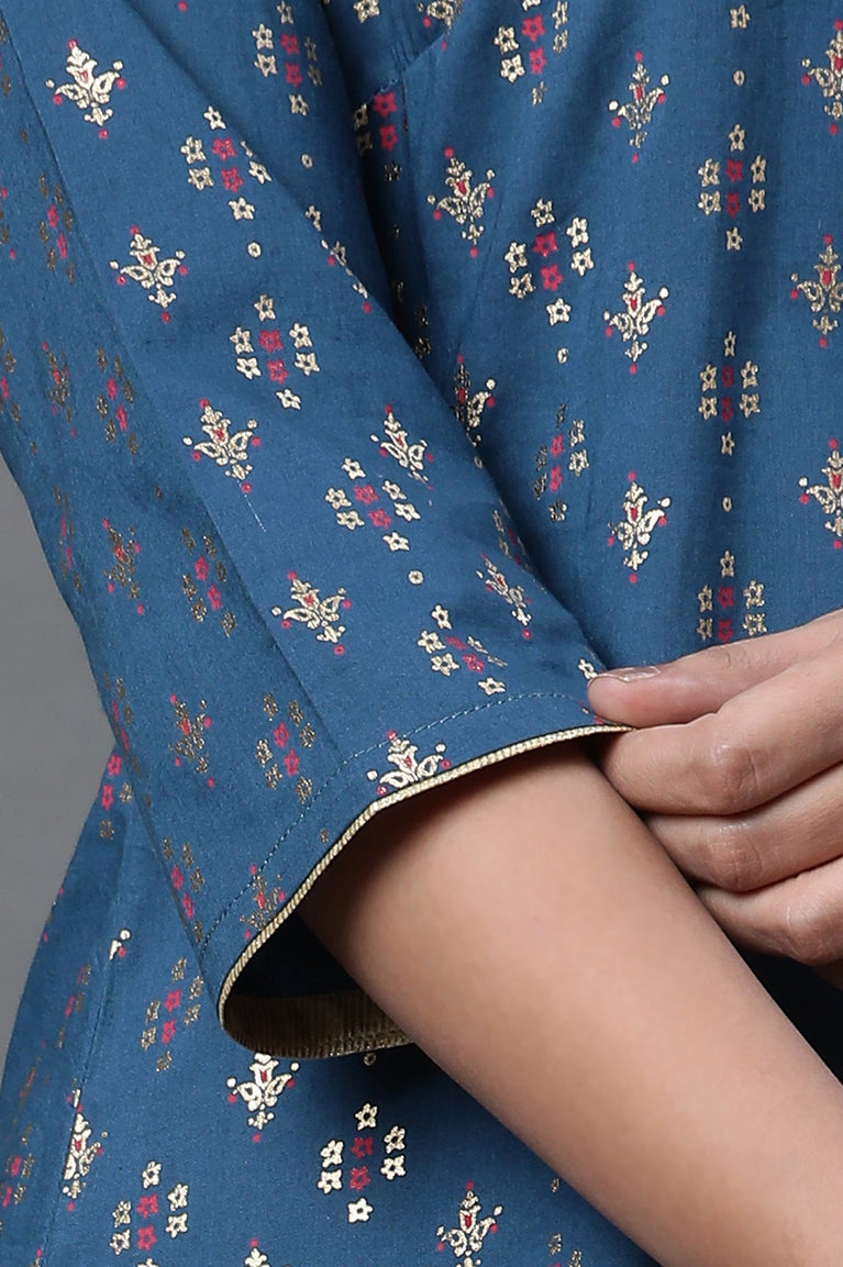 Blue Botanical Printed Dori Embroidery Straight Kota Kurta