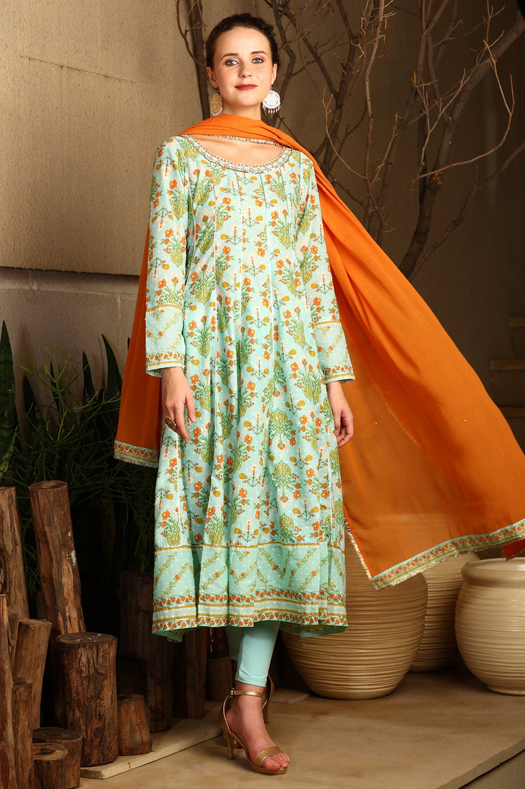 Blue Floral Printed Embellished Panelled Chanderi Kurta, Tights And Dupatta Set
