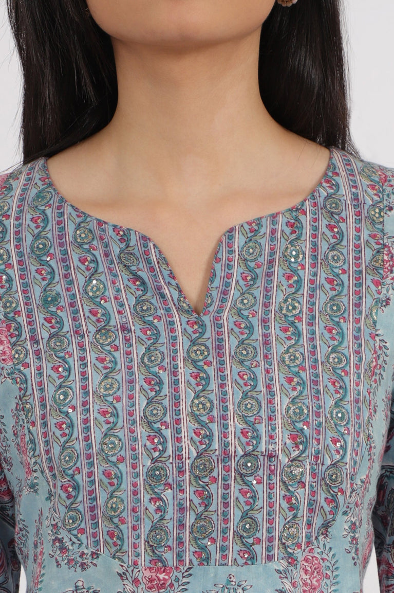 Turkish blue floral print kurta in round neck and three-quarter sleeves, having glitter and sequin detailing.