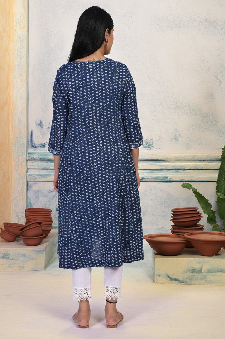 Blue Geometric Dabu Printed Mirror Work A-Line Cotton Kurta