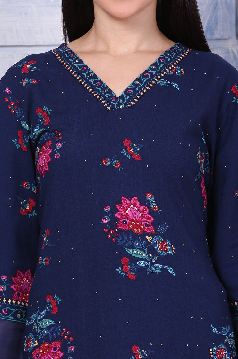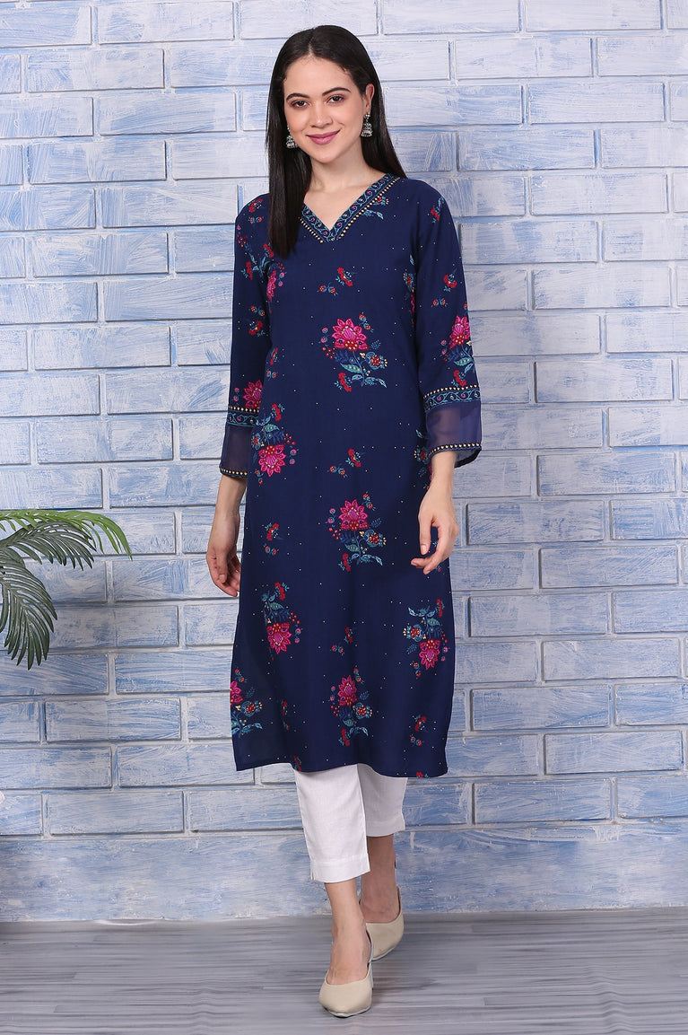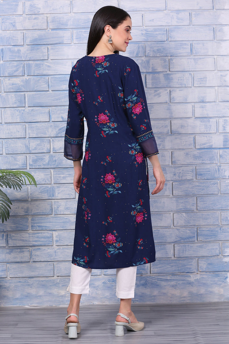 Blue Floral Printed Rayon Straight Kurta