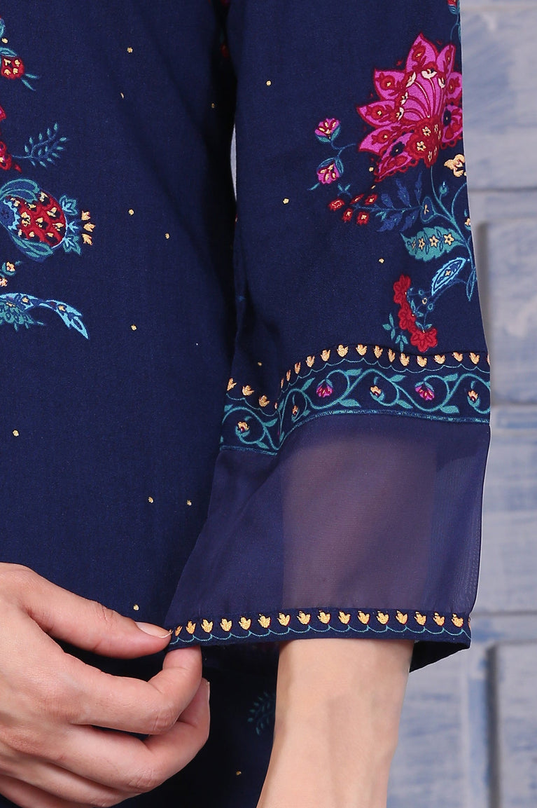 Blue Floral Printed Shantung A-line Kurta