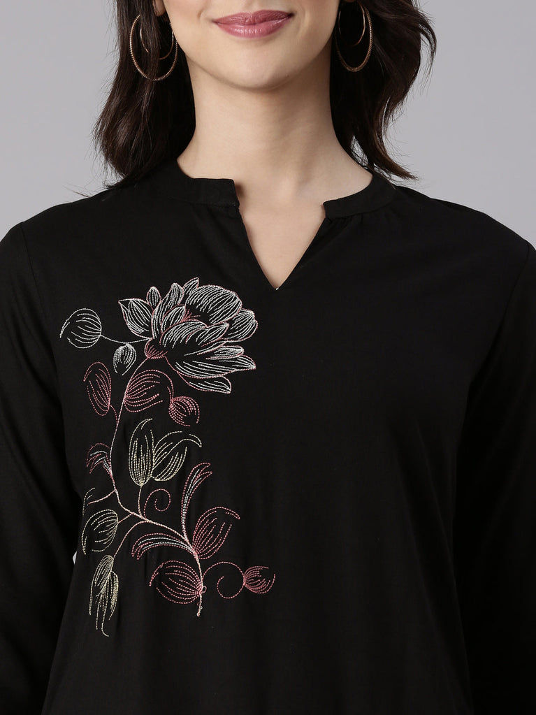 Neeru's Black Regular Straight Embroidered Kurtas This Flirty Kurta Is Perfect For Sprucing Up Your Warm-Weather Wardrobe. Add A Bit Of Boho Vibes To Your Look With The Embroidered Details And Flirty Silhouette!