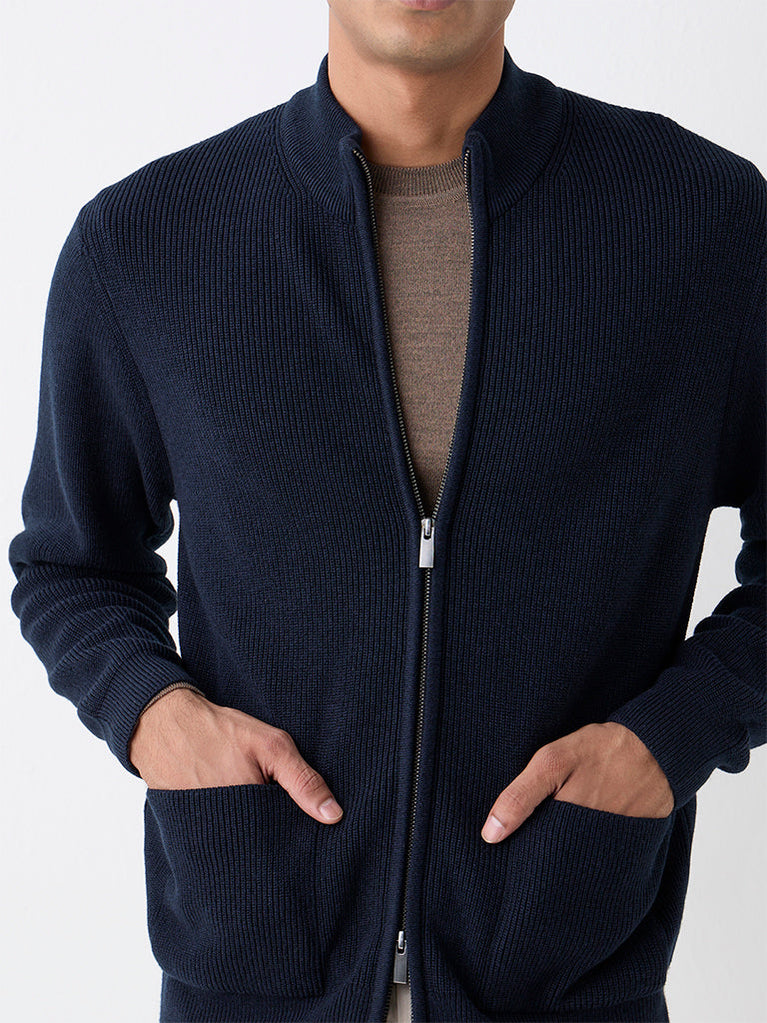 Blending modern function with classic warmth, this navy jacket by Ascot is crafted with a soft knit texture and a high neckline. The zip-front design adds versatility, while front pockets lend a casual, practical edge. A refined layer that transitions seamlessly from city strolls to weekend escapes.