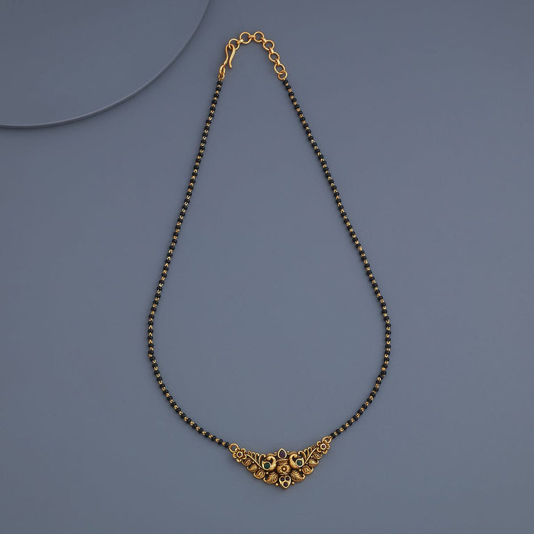Kushal's Fashion Jewellery Flower Motif Antique MangalsutraIf you want to avoid the hassle of pairing your favourite Mangalsutra with earrings, allow our latest set of antique Mangalsutra and matching earrings to handle it for you. Thanks to its studded ruby stones with gold polish, this mangalsutra set with marvellous earrings will be your perfect partner for all events.