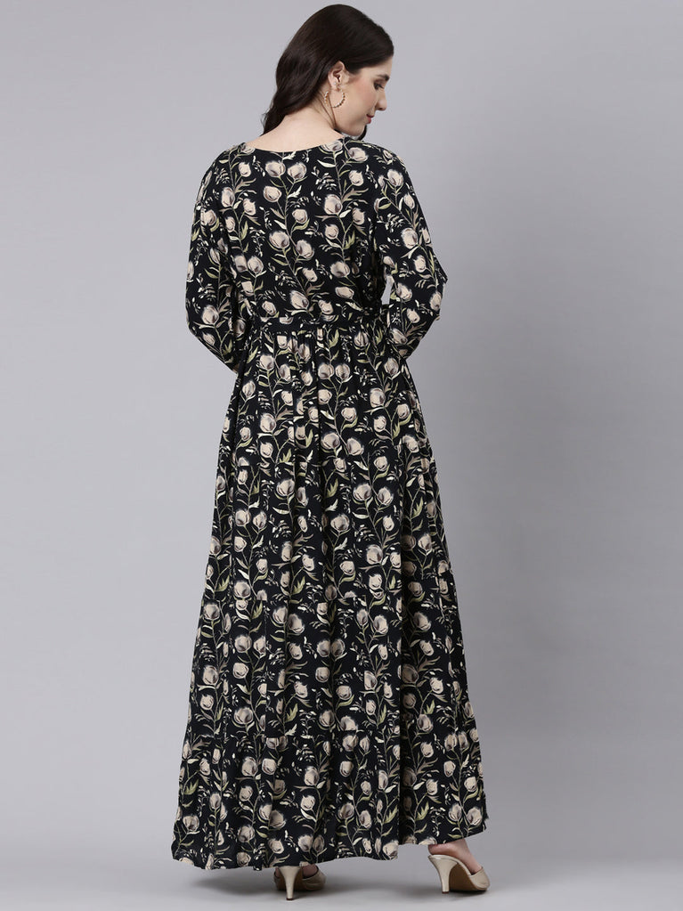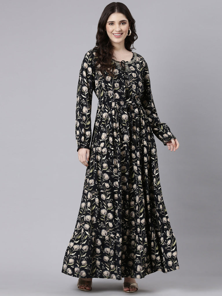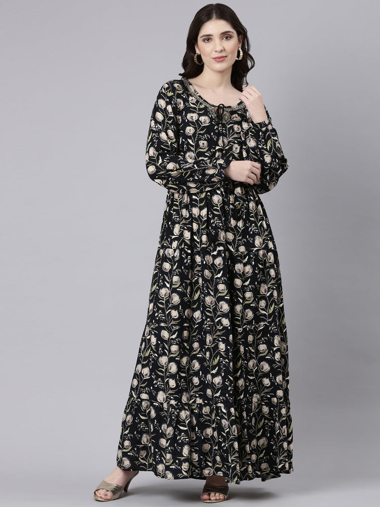 Neeru's Flared Floral Dresses In Black - Perfect For Any Casual Occasion.