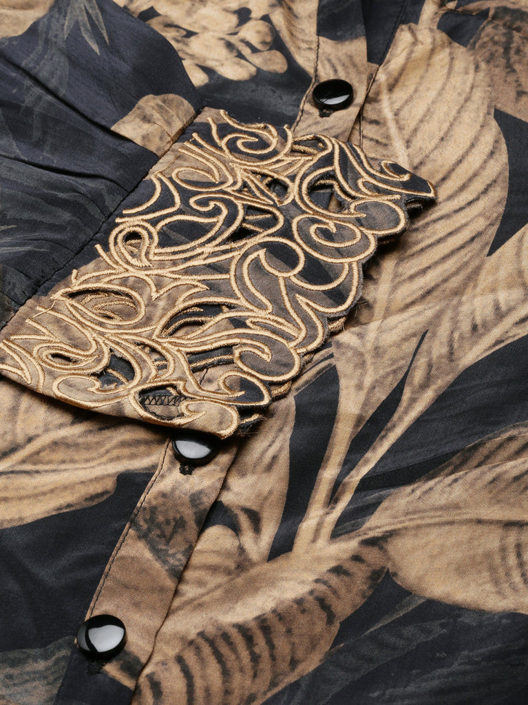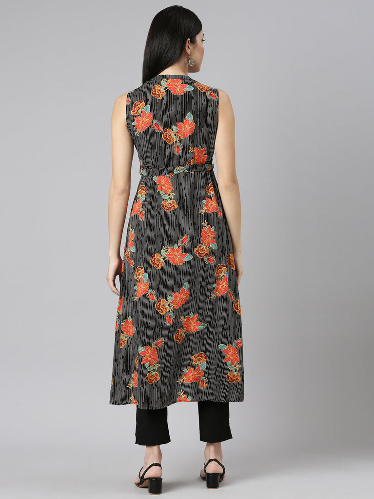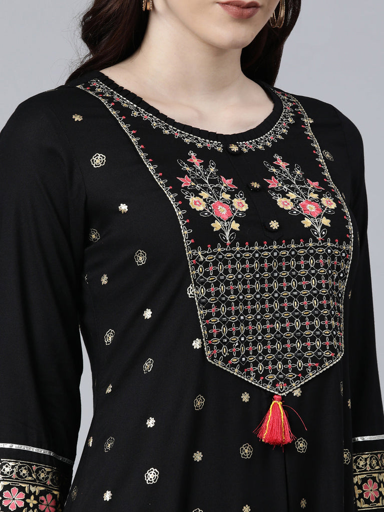 Neeru's Black Regular High-Low Floral Kaftan Kurta Trousers