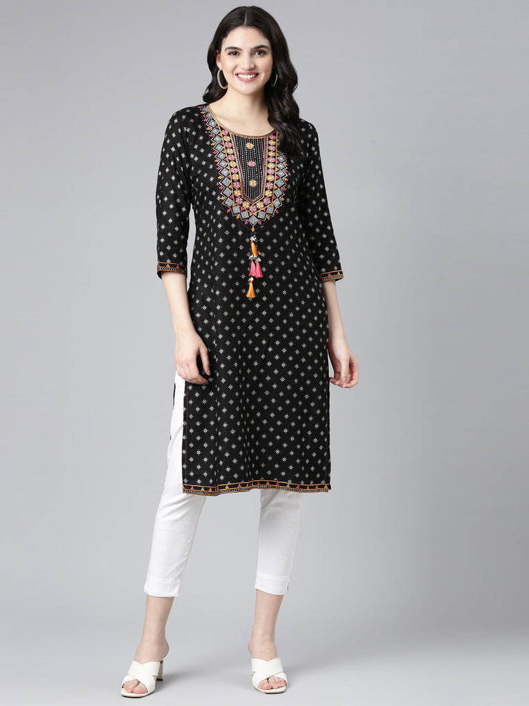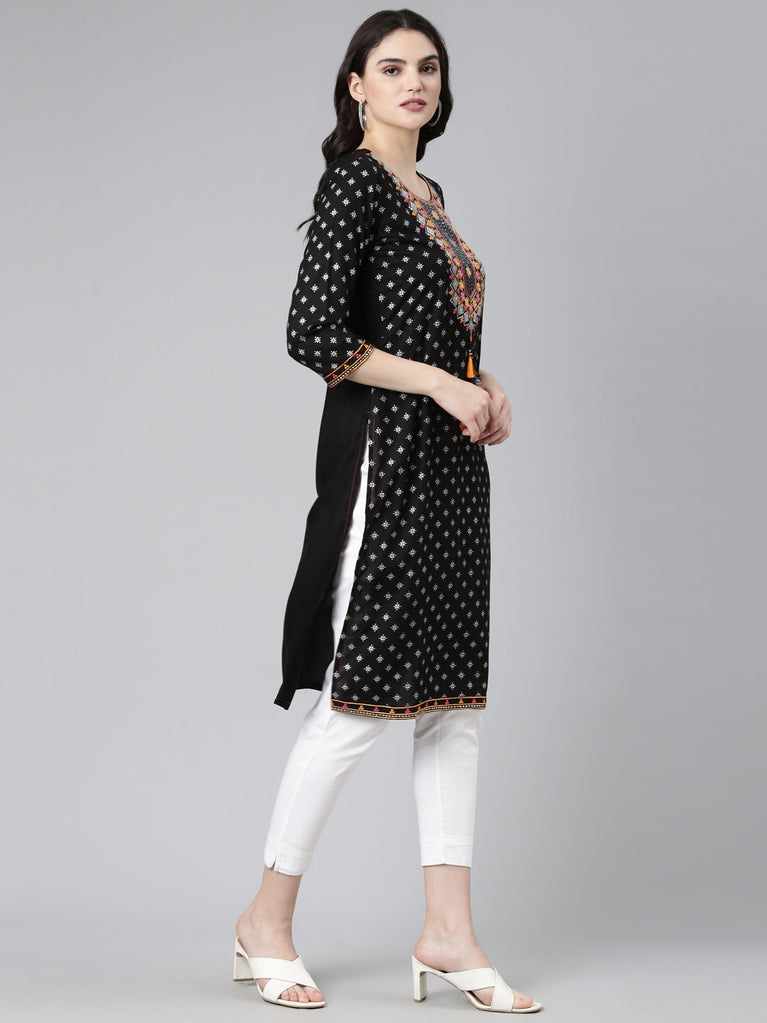 Neeru's Black Regular Straight Embroidered Kurtas This Flirty Kurta Is Perfect For Sprucing Up Your Warm-Weather Wardrobe. Add A Bit Of Boho Vibes To Your Look With The Embroidered Details And Flirty Silhouette!
