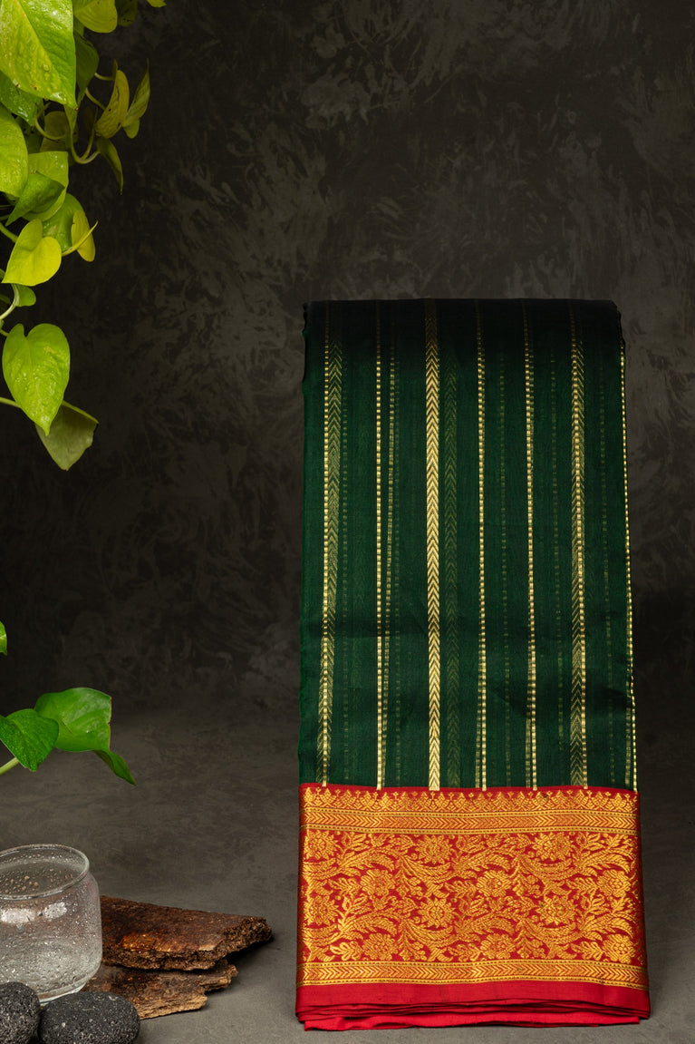Mandir Bottle Green & Red Chanderi Lines Saree