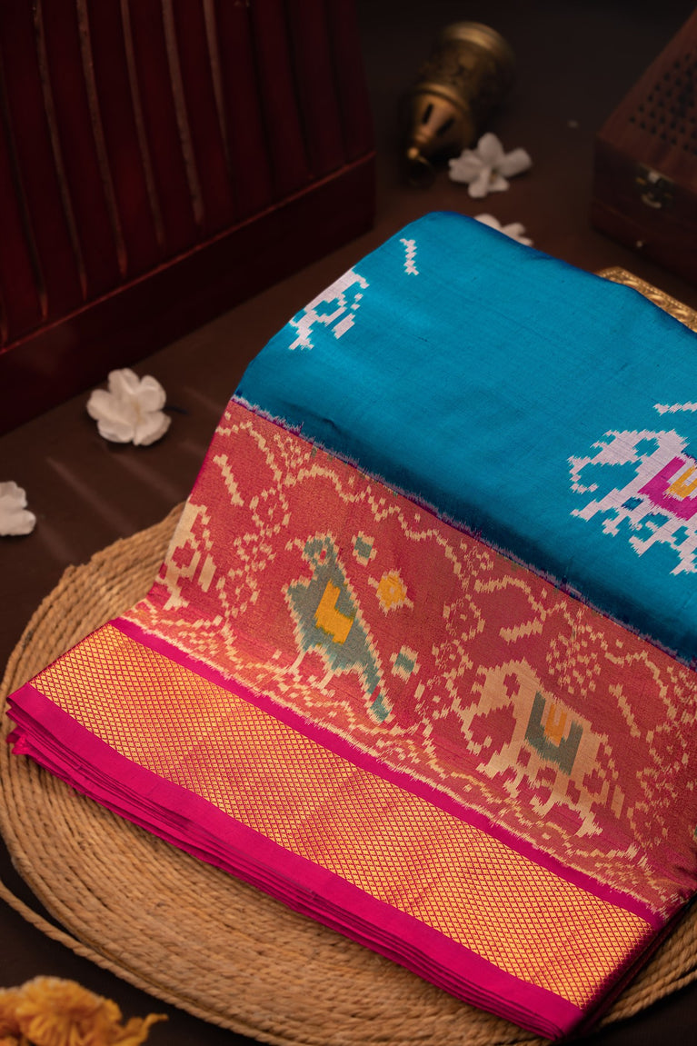 Mandir Blue & Pink Ikat Ikat Saree