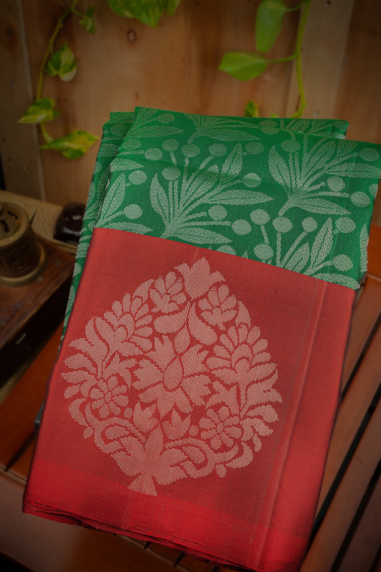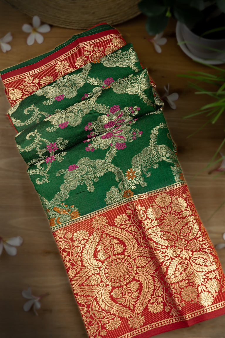 Mandir Bottle Green & Red Fancy Floral Jaal Saree