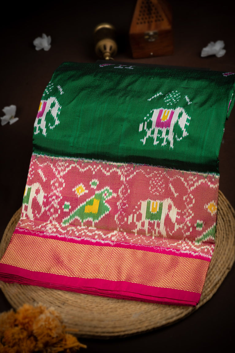 Mandir Bottle Green & Magenta Kanchi Ikat Ikat Saree