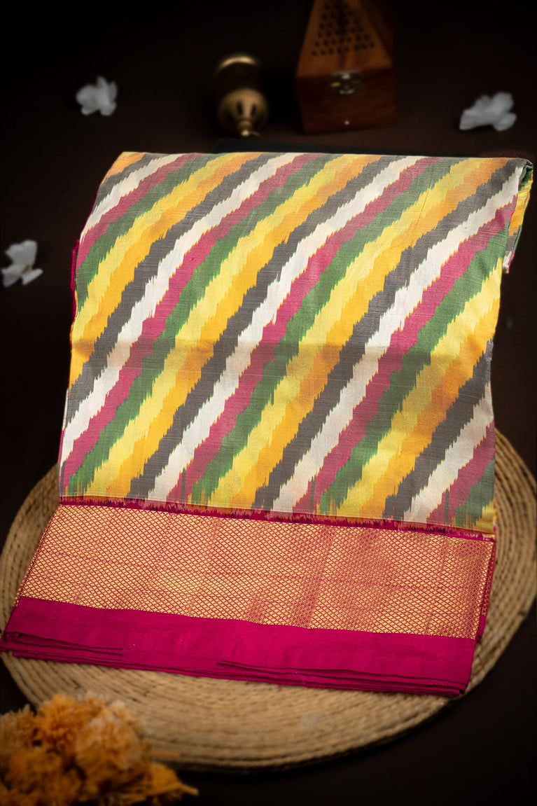 Mandir Multi-Colour & Magenta Kanchi Ikat Lines Saree