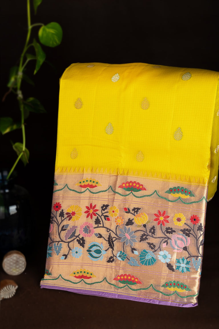 Mandir Violet & Yellow Kuppadam Buttis Saree
