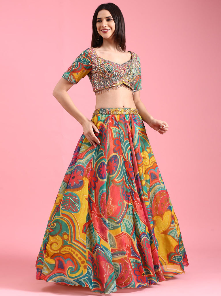 Elevate your festive wardrobe with this Multi-color Organza Printed Ghagra Choli Set. Crafted from lightweight organza, the ensemble features delicate prints that blend vibrant hues for a graceful look. The flowing ghagra paired with the tailored choli ensures comfort while enhancing your silhouette, making it perfect for weddings and special occasions. This set combines traditional charm with contemporary elegance effortlessly.