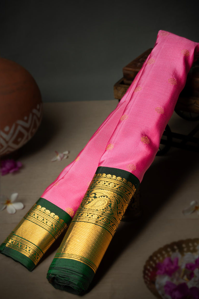 Varamahalakshmi Blush Pink & Bottle Green Gadwal Buttis Saree