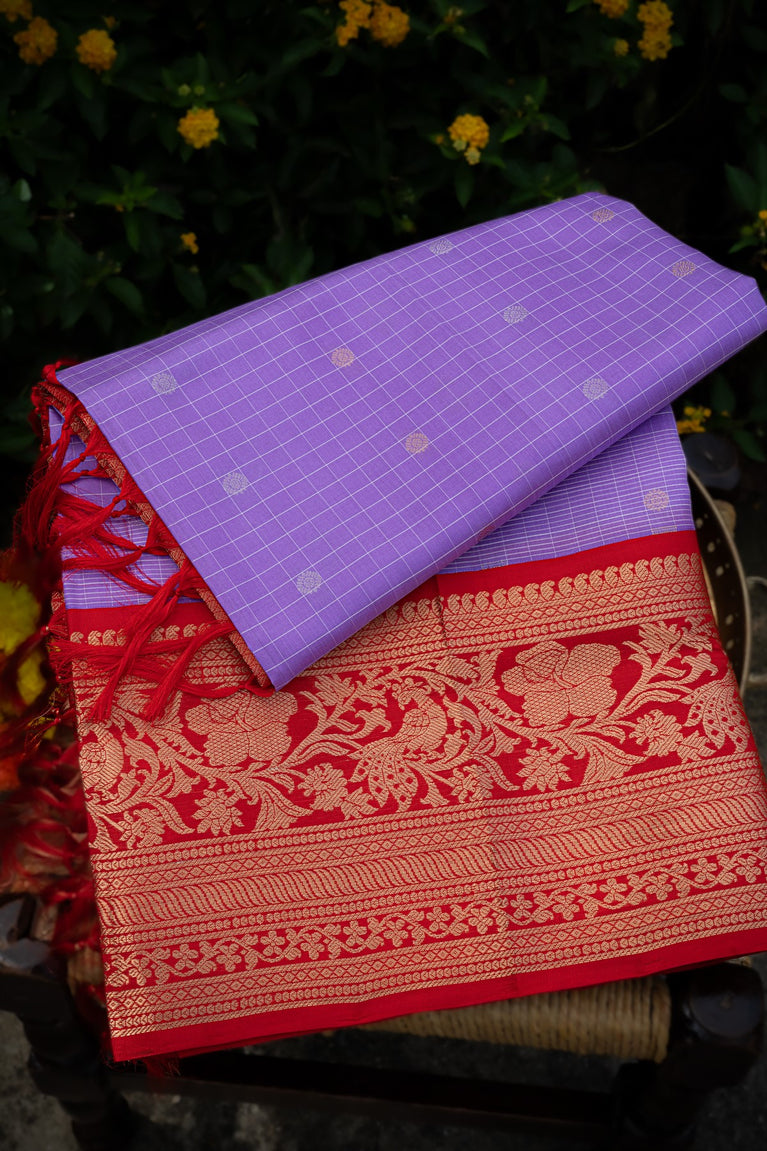 Varamahalakshmi Lavender & Red Kuppadam Checks And Buttis Saree
