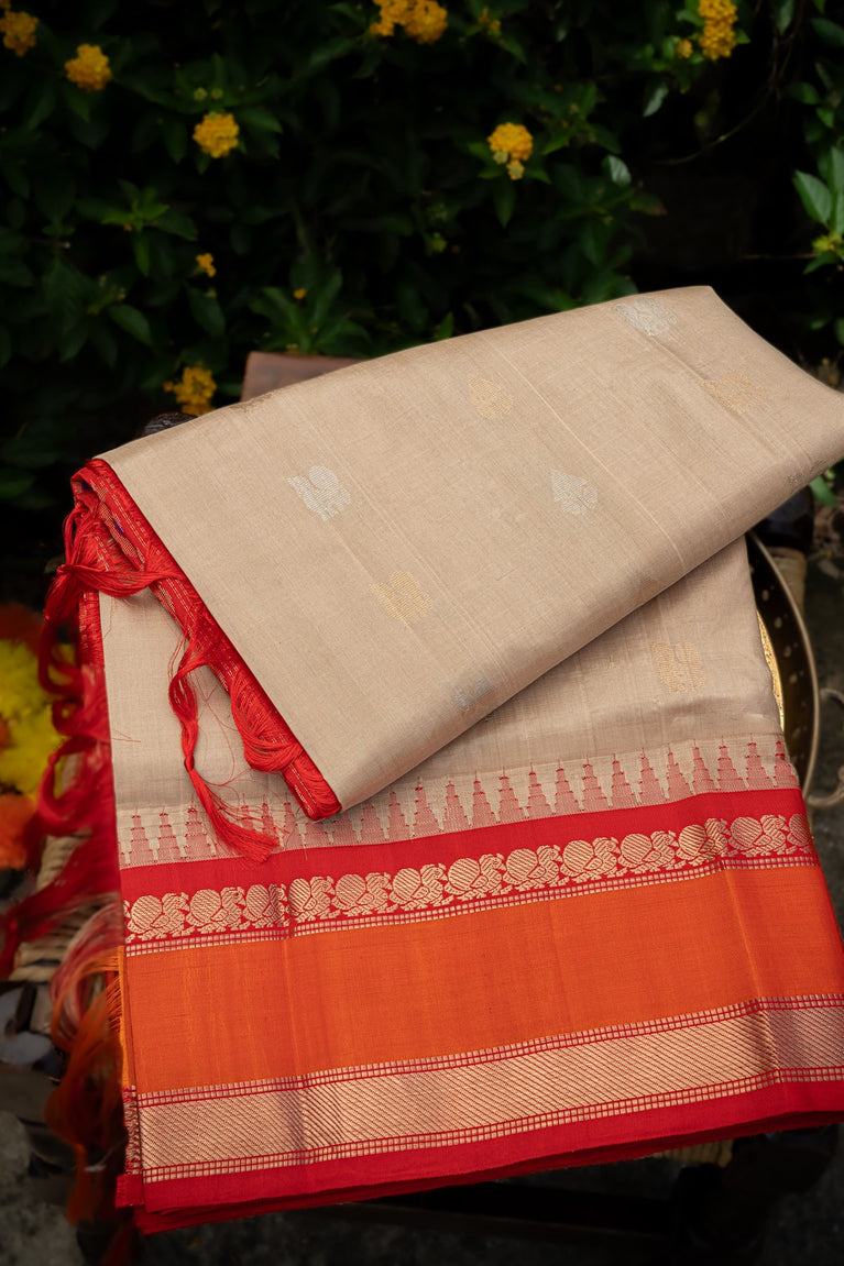 Varamahalakshmi Light Brown & Red Kuppadam Buttis Saree