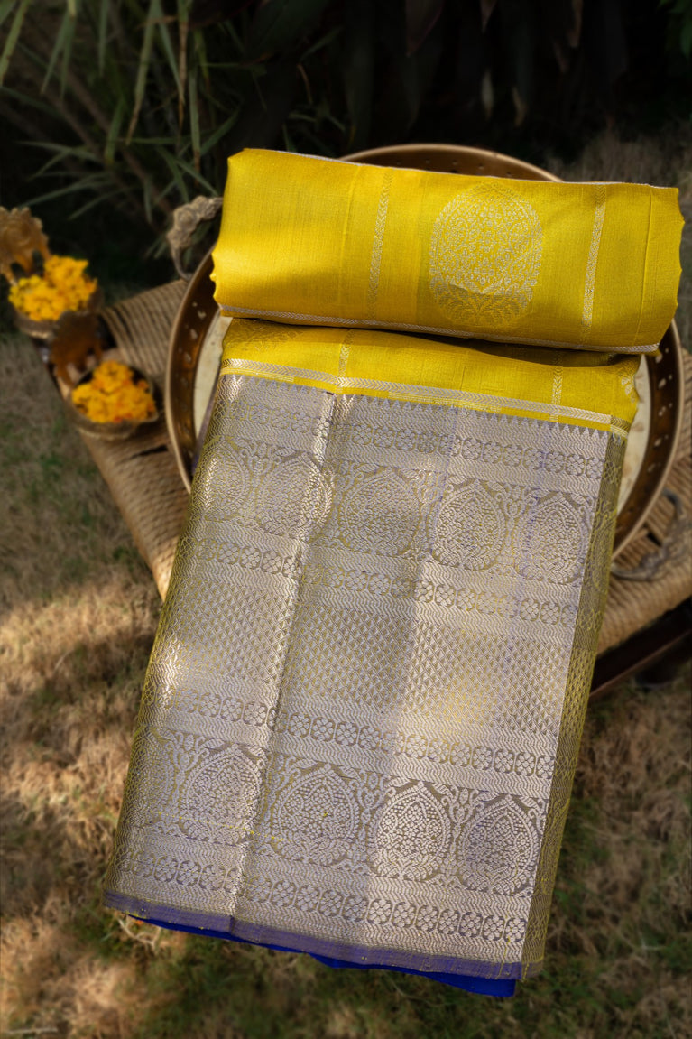 Varamahalakshmi Mustard & Royal Blue Kuppadam Checks And Buttis Saree