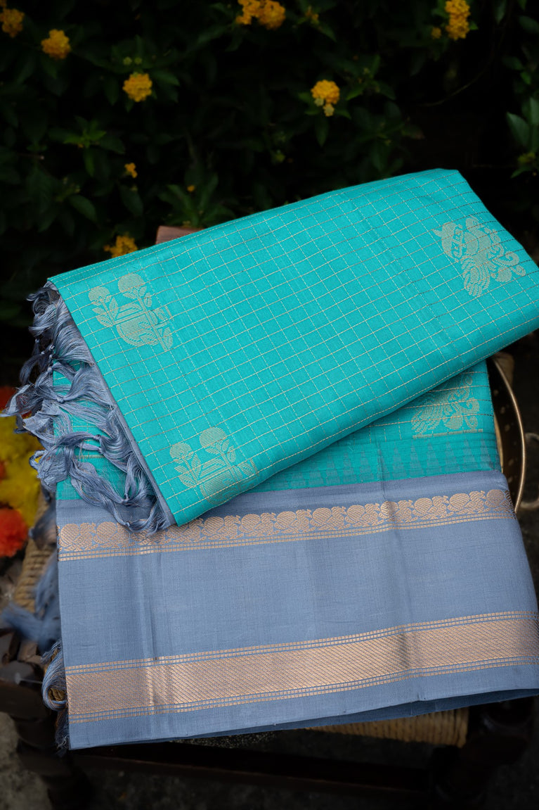 Varamahalakshmi Sea Green & Space Grey Kuppadam Checks And Buttis Saree