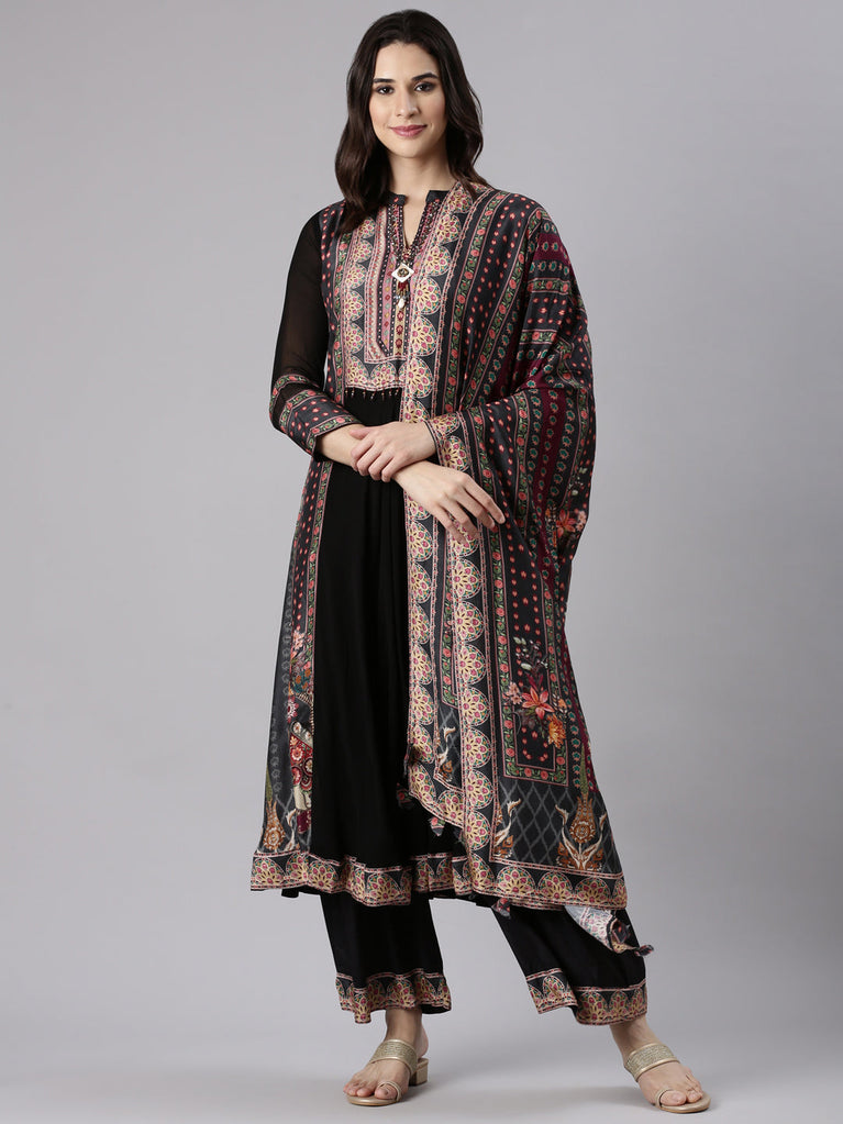 Elevate your wardrobe with this Black Georgette Printed Three Piece Set, featuring a graceful blend of comfort and style. The lightweight georgette fabric drapes beautifully, while the intricate prints add a refined touch. Perfect for formal events or elegant gatherings, this set offers a polished look with effortless charm.