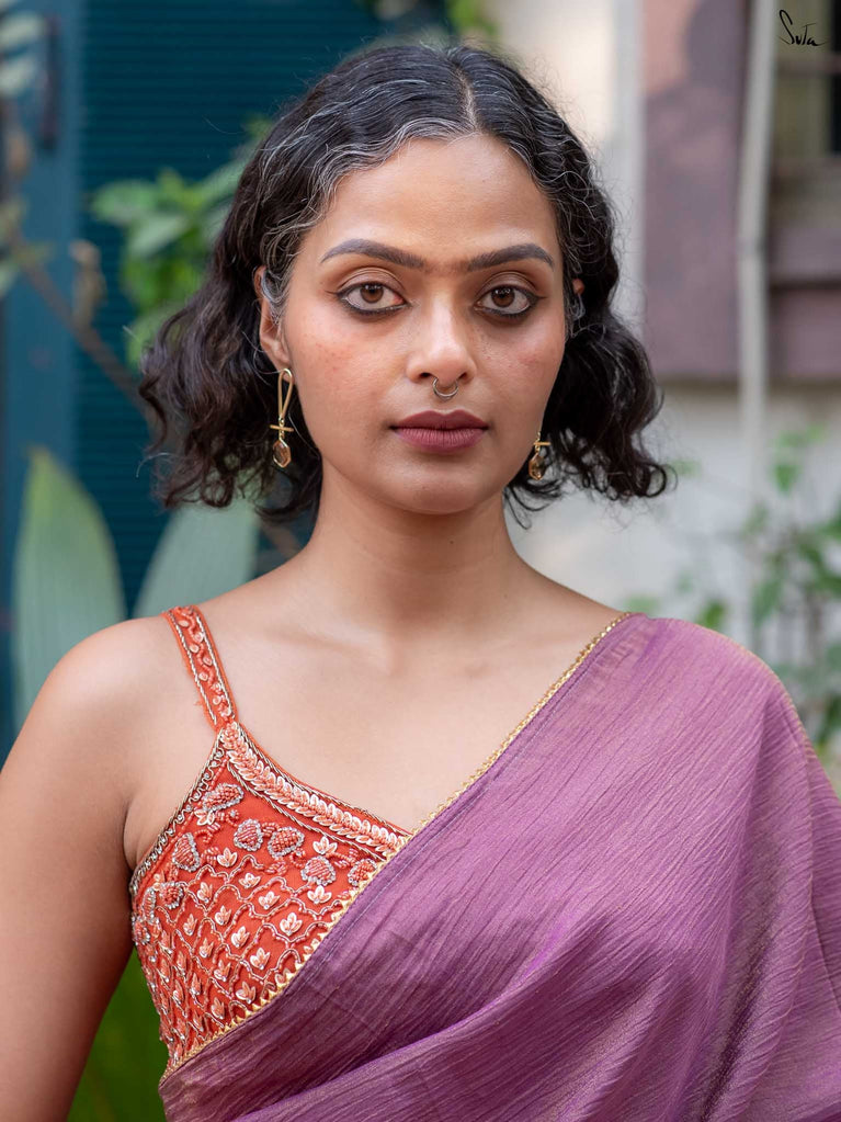 Blush is a sophisticated Orange blouse from the Rangrez collection, crafted to blend heritage artistry with modern elegance. Made in soft cotton muslin, it features traditional Bandhani tie-dye patterns and 1/4th sleeves with a classic collar neck. The gold lace detailing on the sleeves and neckline adds a subtle festive shimmer, making Blush a perfect companion for Rangrez sarees or as a standalone statement for celebrations.