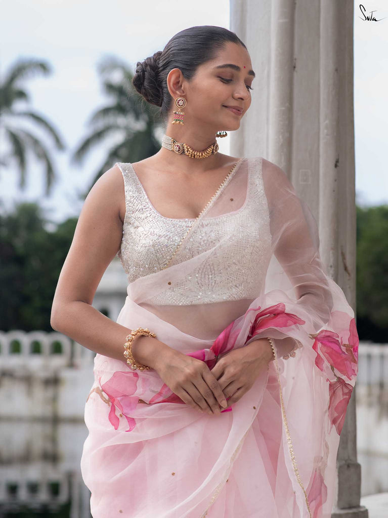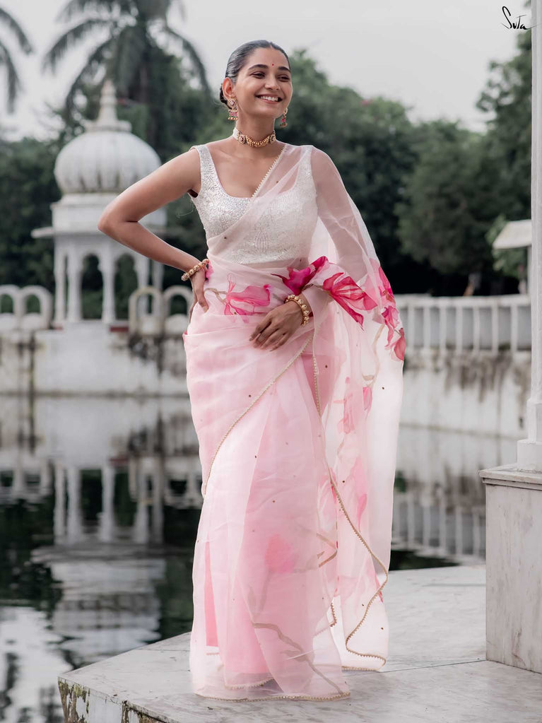 The model is wearing size S blouse and the saree is Shaadi Hai