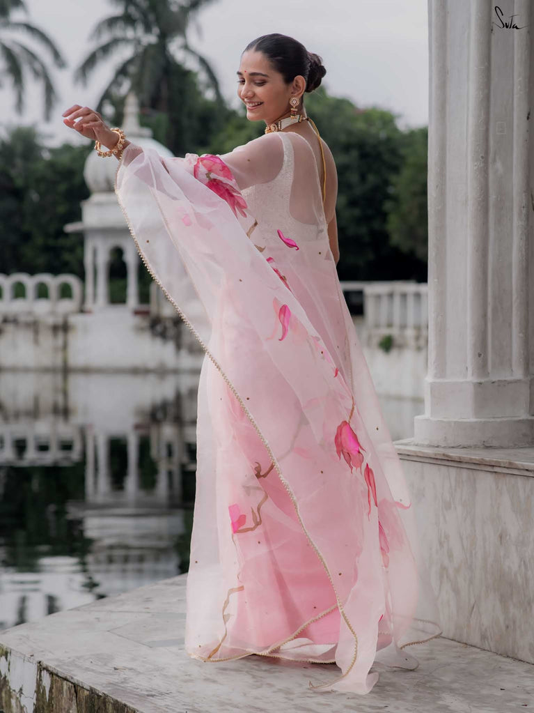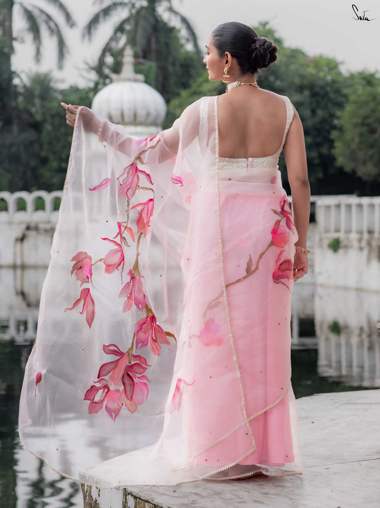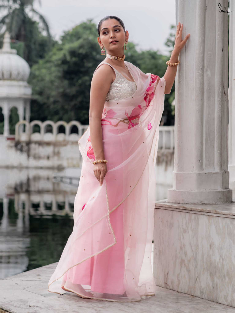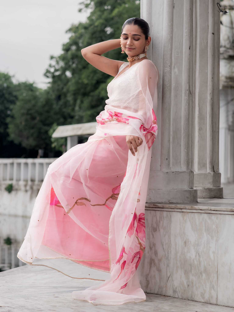Light as air and translucent like a rainbow, organza silk is a fabric that exudes delicate grandeur. Woven with twisted silk yarn on the warp as well as the weft, this fabric is hailed for its slight transparency and its slightly stiff and yet fluid texture. The slight sheen adds to its charisma, making it the perfect saree to drape for both festive and formal occasions.