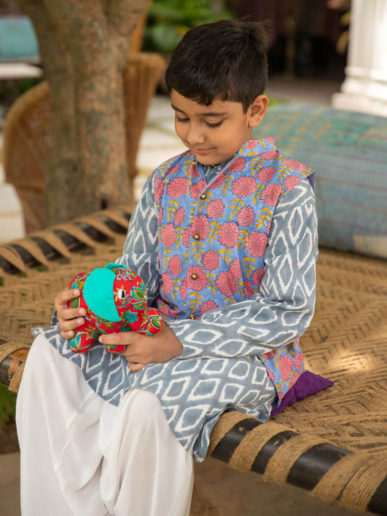 Set of 3 - Anant Organic Cotton Block Printed Long Kurta with Jacket