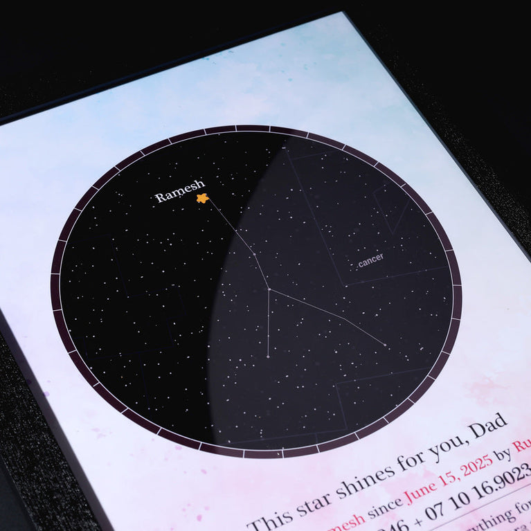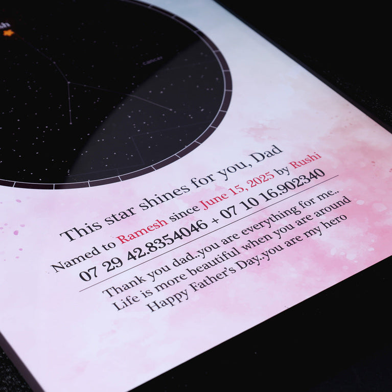 Dads are our real-life superheroes - strong, steady, and always shining. Let’s honour them with something as timeless as their love.Name a star after your dad and surprise him with a gift that’s out of this world. All you need to do is share his name, zodiac, and a special date - and we’ll name a star exclusively for him.The star comes customized with your father's name and a constellation chart showcasing the exact location of the star. You can also add a personalized message to make it even more touching.How does 'Name a Star' actually work?This unique service utilizes the 'Star Dedication Archive,' a comprehensive database of recognized stars in our solar system with their precise coordinates. Once a star is dedicated, it receives a special name and a certificate is generated for it. The registration number on the certificate provides exclusive access to the star's details in the archive, ensuring that no other star will bear the same name.Specifications :Size of the frame (with acrylic glass) - A4