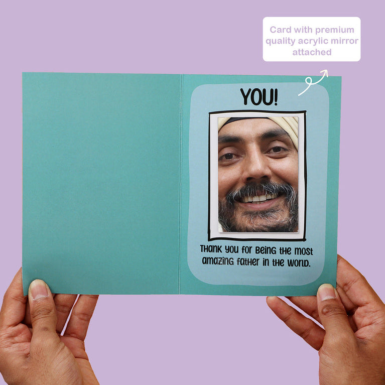 Mini Mirror Card – Here’s a magical greeting card for your amazing dad! This special greeting card is made with premium paper and includes a mirror attached inside so that when your dad opens the card, he sees the real hero being celebrated—himself.