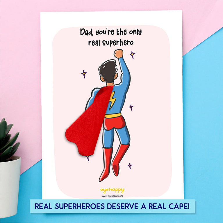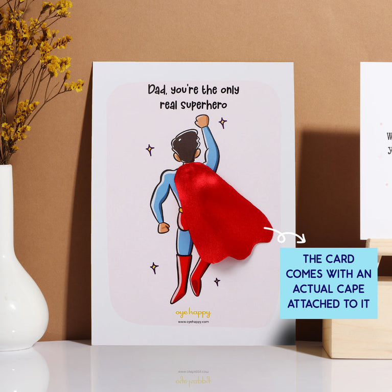 Dads are the real superheroes of our lives. Tell her that with this card which has an adorable little cape attached to it.Specifications:Size of the Card : A5Content on the Card : Dad, you're the only real superhero. Happy Father's Day!