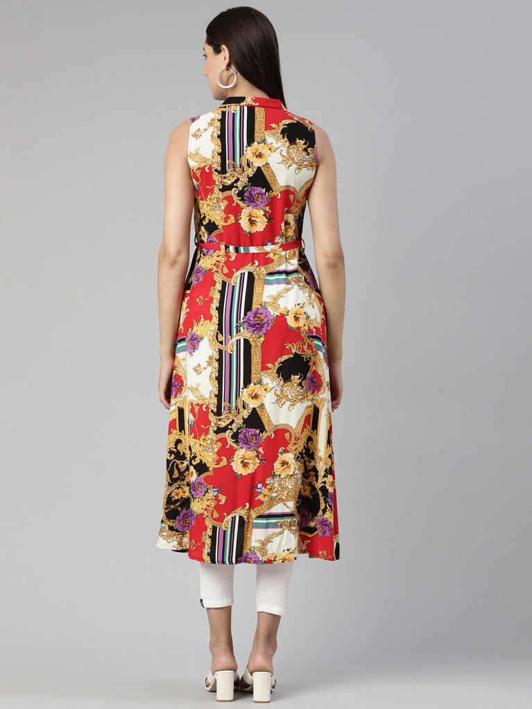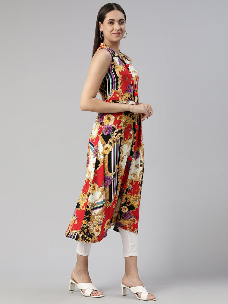 Neeru's Ethnic Motifs Printed Silk Sleeveless Maxi Ethnic Dress With Belt