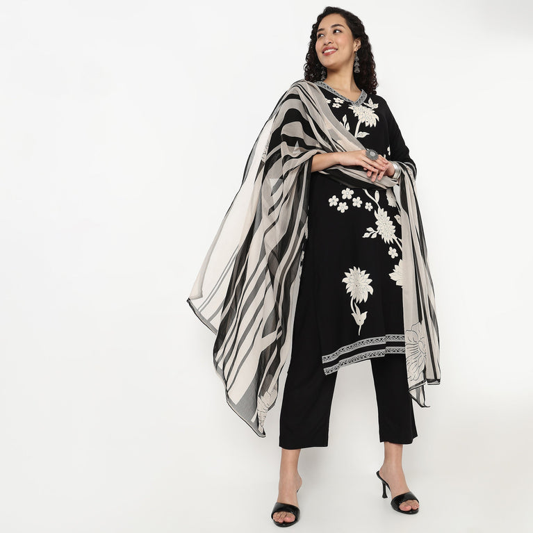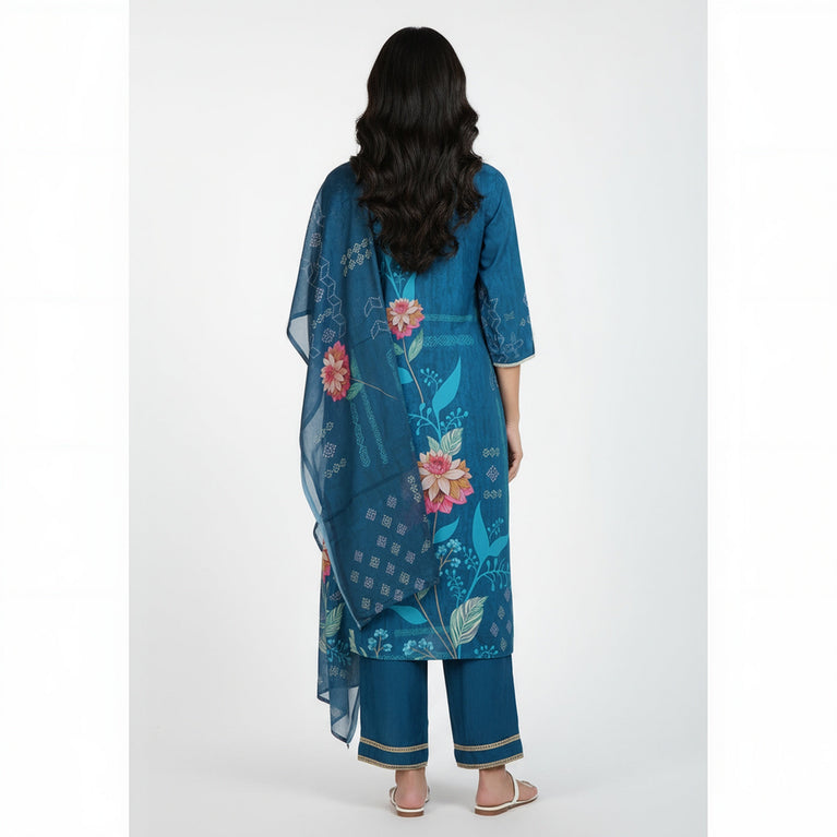 V-Neck Printed Kurta and Pant with Dupatta Set