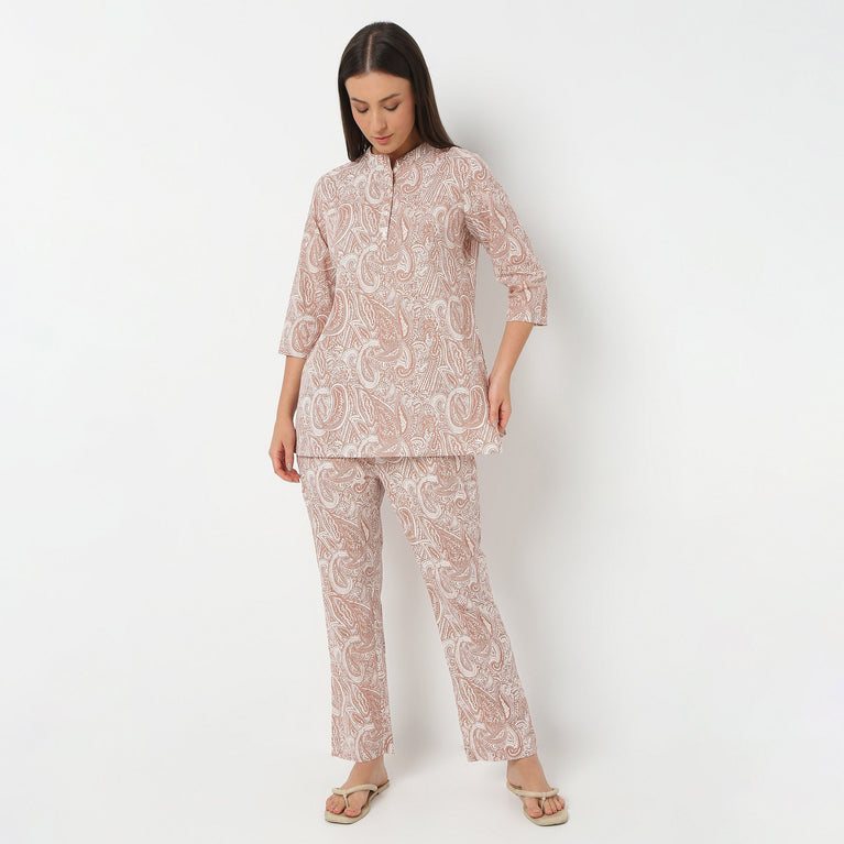 Band Collar Three-Fourth Sleeve Printed Jaipuri Top With Pyjama Sleepwear Set