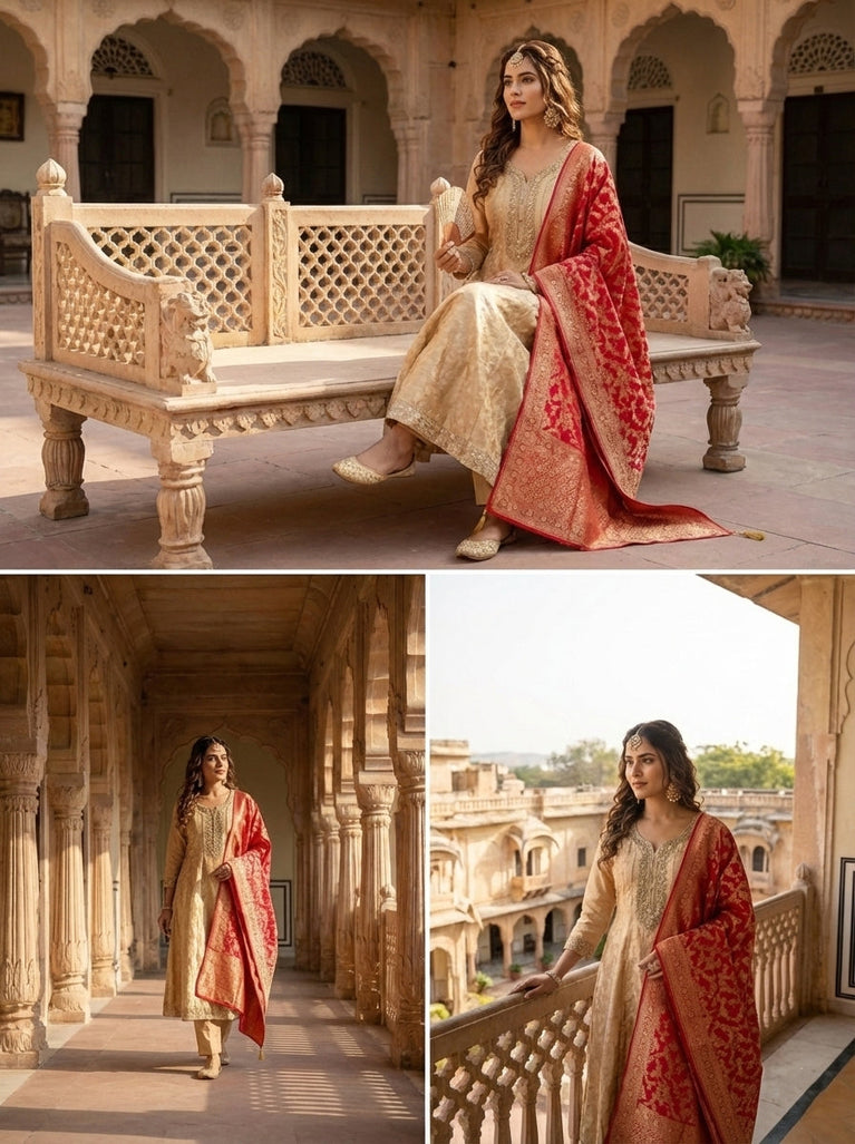 Cream Banarasi Heavy Stone Work Three Piece Set