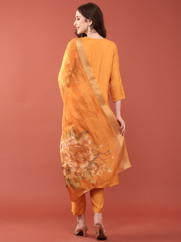 Elevate your wardrobe with this Burnt Orange Dola Silk Three Piece Suit Set. Crafted from lustrous Dola silk, this ensemble offers a rich texture and vibrant color that enhances your natural glow. The set includes a beautifully tailored kurta, matching bottoms, and a coordinating dupatta, perfect for festive occasions or elegant gatherings. Experience the blend of tradition and modern style while feeling comfortable and confident throughout your day.