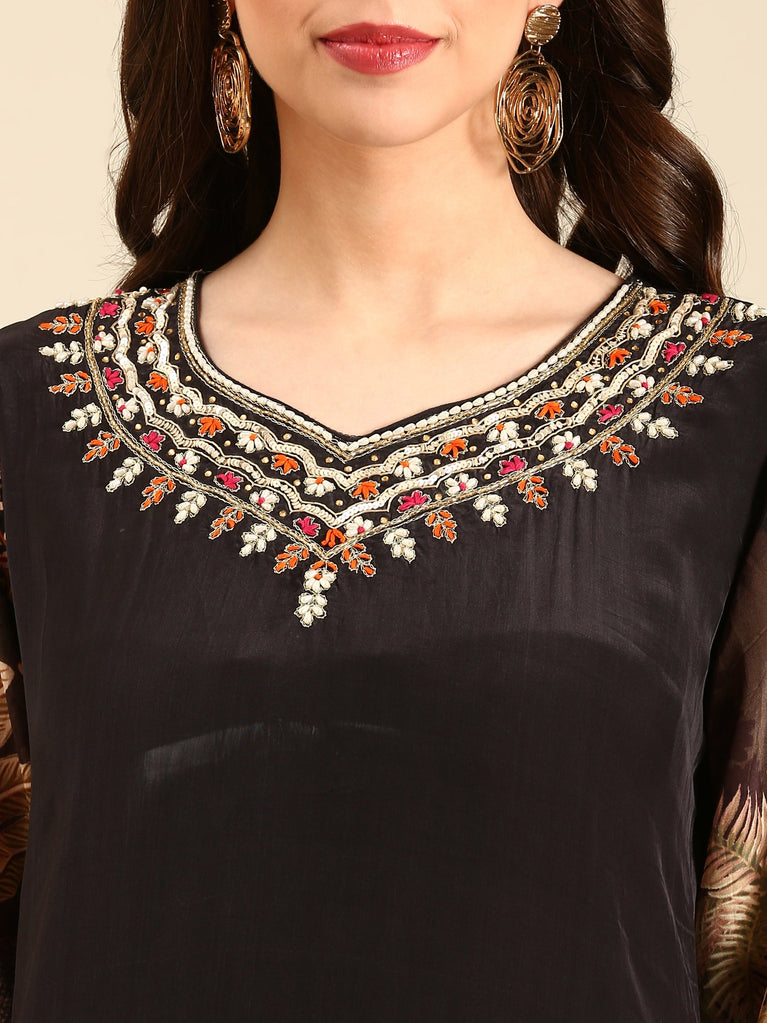 Discover elegance in this brown crepe three-piece suit set, adorned with striking digital prints on black crepe fabric. The V-neck enhances a flattering silhouette, while detailed kardhana and knot work add exclusive craftsmanship. Perfect for those who seek style and sophistication in one ensemble, this set ensures you stand out with confidence wherever you go.