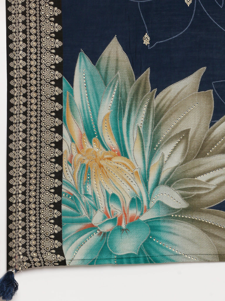 This elegant Cream and Black three-piece suit set features a beautifully printed design enhanced with gold zari embroidery for a subtle yet striking look. Crafted from soft Modal fabric, the anarkali suit includes a cream neck and dhaman sleeves adorned with gold zari laces and delicate sequins, adding a refined shimmer to your outfit. Ideal for festive occasions, this set offers both comfort and style, allowing you to celebrate with grace and confidence.