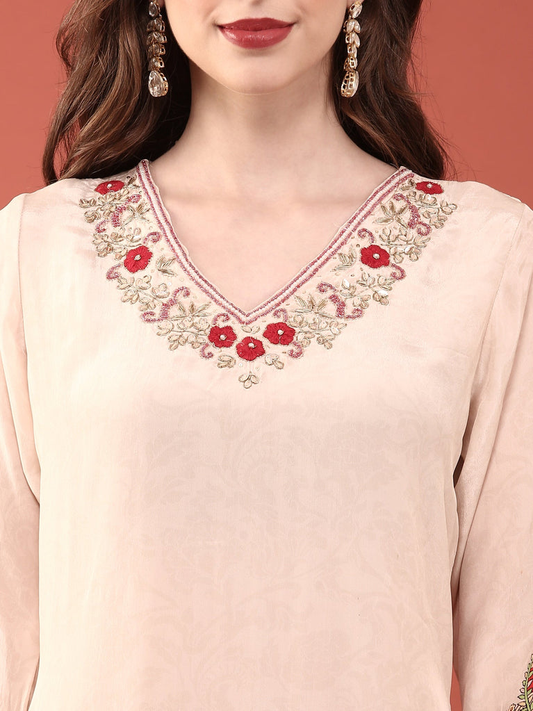 Cream Crepe Printed Embroidery Three Piece Suit Set