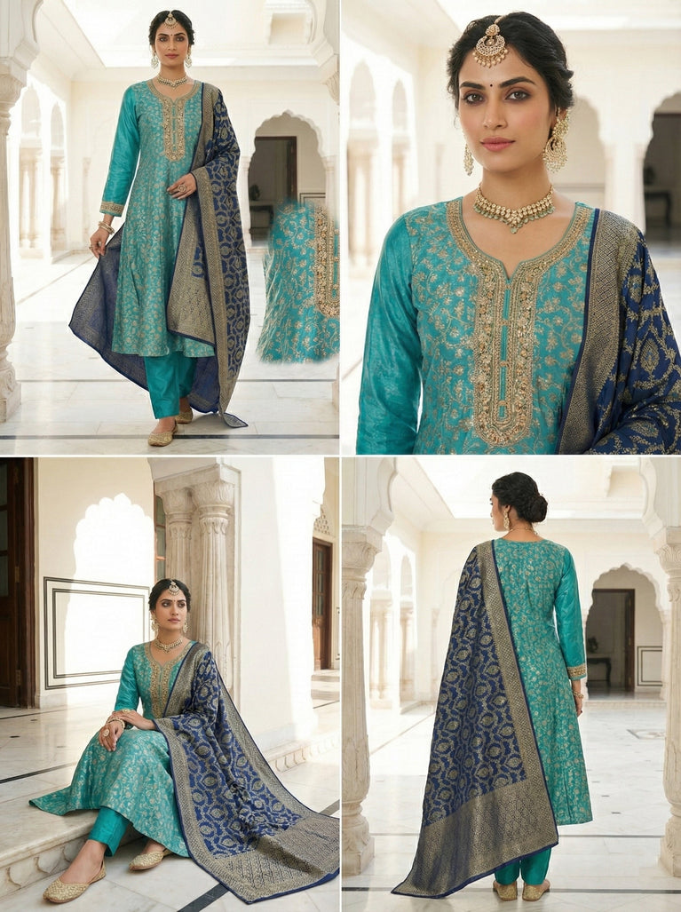 Elevate your ethnic wardrobe with this stunning Ferozi Banarasi Zari Floral Embroidery Three Piece Set. Crafted with traditional Banarasi weaving techniques, this ensemble features intricate zari work and delicate floral embroidery in a captivating ferozi shade. The three-piece set offers versatility for weddings, festivals, and special occasions. Rich in heritage and contemporary in appeal, each piece showcases meticulous craftsmanship that celebrates timeless Indian artistry. Perfect for those who appreciate authentic traditional wear with refined elegance.