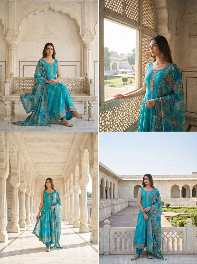 Elevate your ethnic wardrobe with this exquisite Ferozi Silk Floral Digital Print Suit Set. Crafted from premium silk fabric, this ensemble features intricate digital floral prints that showcase contemporary design sensibilities. The rich ferozi hue provides a sophisticated backdrop for the detailed botanical motifs, making it ideal for festive occasions, celebrations, and formal gatherings. The suit set combines traditional silhouettes with modern printing techniques, ensuring both comfort and elegance. Perfect for those who appreciate fine craftsmanship and refined aesthetics, this piece seamlessly transitions from daytime events to evening functions while maintaining its luxurious appeal.