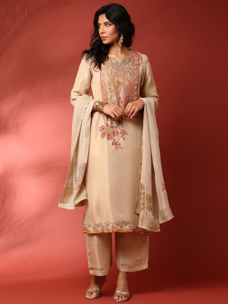 Gold Beige Tissue Aplique work three piece suit set