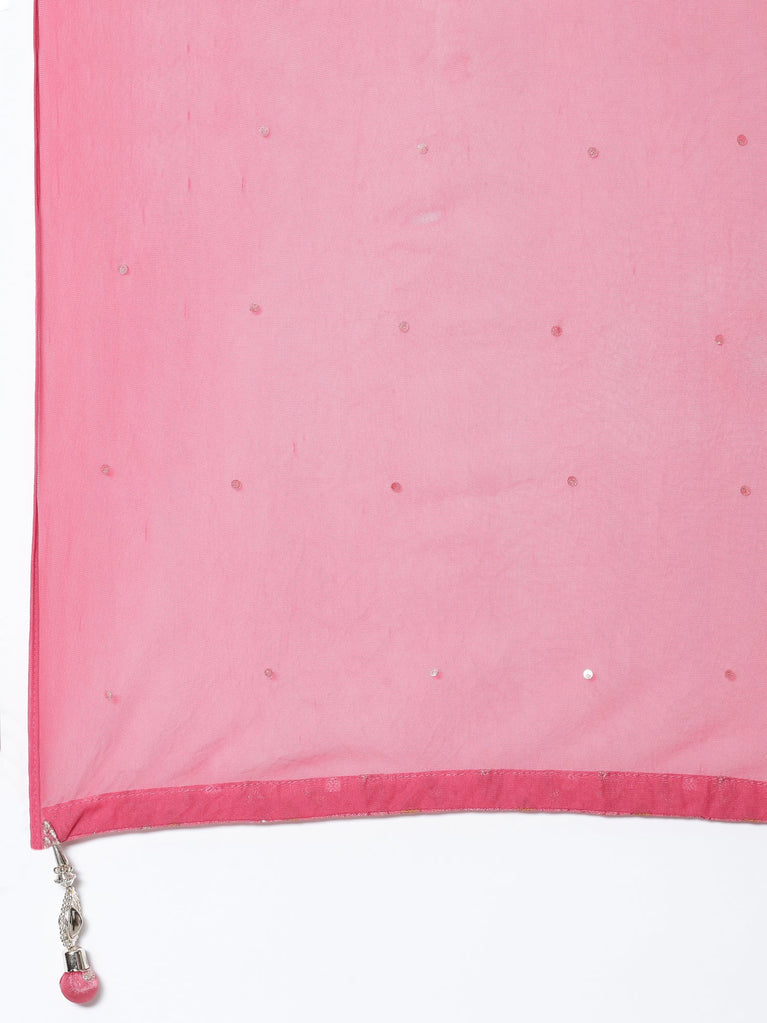 Embrace the elegance of this rose pink rayon suit set, featuring a digital print yoke richly embellished with kardhana beads and hand-applied sequins. The exquisite handwork adds a radiant shimmer, enhancing the delicate fabric's charm. Perfect for festive occasions, this ensemble combines traditional craftsmanship with contemporary style to make you shine with confidence and grace.
