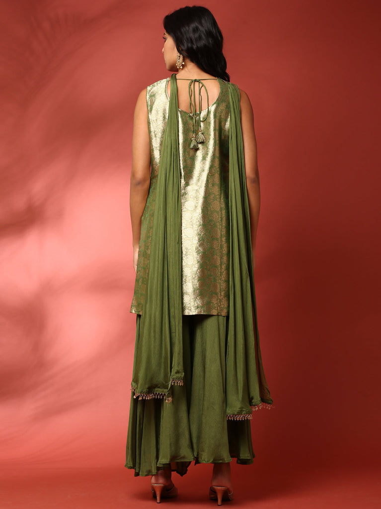 Green banarasi silk embroidered short kurta and palazoo Three piece set