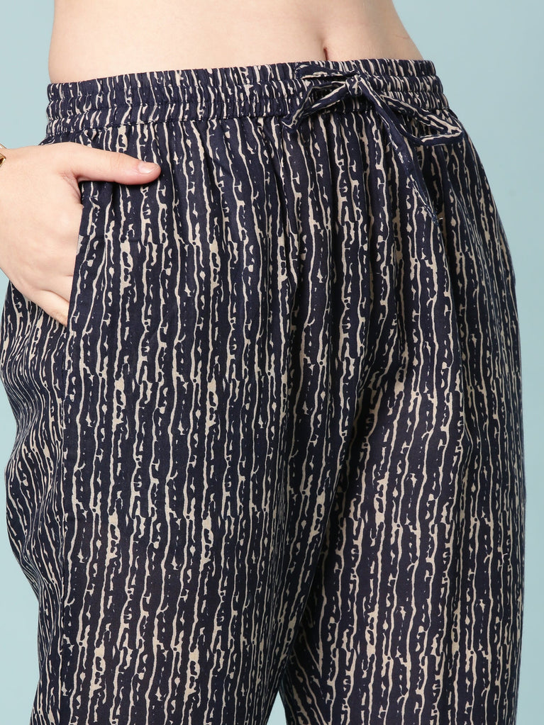 Elevate your ethnic wardrobe with this Indigo Cotton Printed Anarkali Three Piece Set. Crafted from breathable cotton, it offers comfort alongside elegance, featuring intricate prints that enhance its timeless appeal. This ensemble includes a flowing Anarkali kurta, matching bottoms, and a coordinating dupatta, perfect for festive occasions or refined gatherings. The lightweight fabric ensures ease of movement while maintaining a graceful silhouette, making it a sophisticated choice for cultural celebrations.