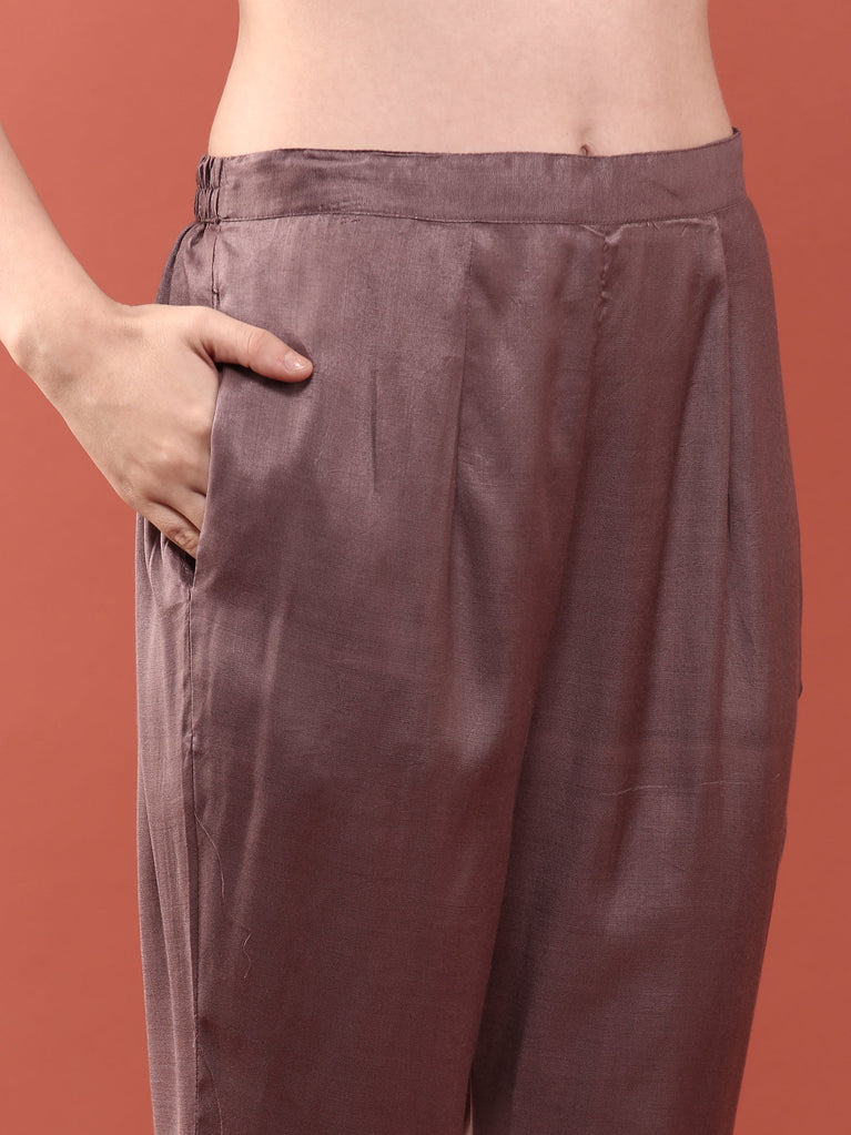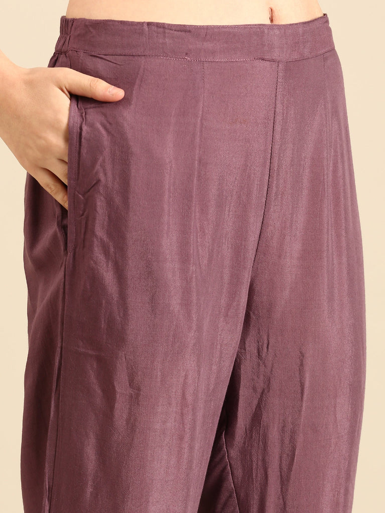 Elevate your ethnic wardrobe with this exquisite Lilac Chinnon three-piece ensemble. Crafted from premium chinnon fabric, known for its lightweight breathability and elegant drape, this set combines traditional sophistication with contemporary styling. The soft lilac hue offers versatility for both festive occasions and everyday wear.